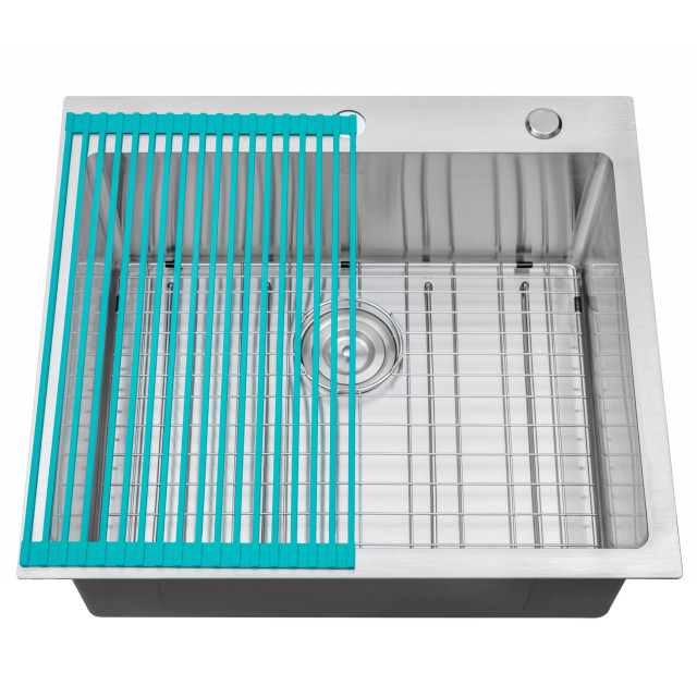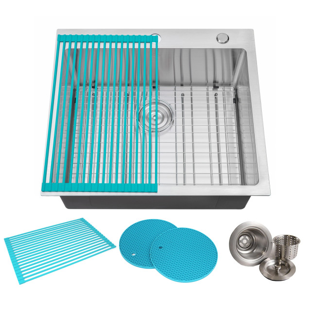 CozyBlock 25 Inch 16-Gauge Stainless Steel Topmount Drop-in Single Bowl Kitchen Sink in Brushed Stainless Steel Finish with Bottom Grid Set, Silicone Dishrack, Pot Mat, and Strainer