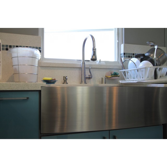 This Farmhouse Apron Front kitchen sink is finished on the side and back, so there are 3 (three) different ways to install this sink - Undermount (Under-Counter), Flush-Mount, and Built-Up: