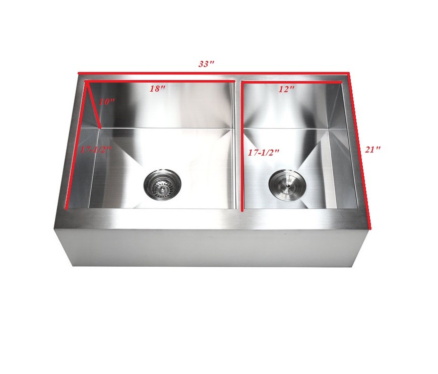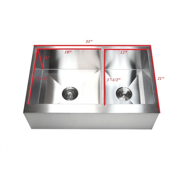 | Dimensions | 33" x 21" (Overall Exterior) 18" x 17-1/2" (Left Bowl) 12" x 17-1/2" (Right Bowl) 10" (Apron Depth) |