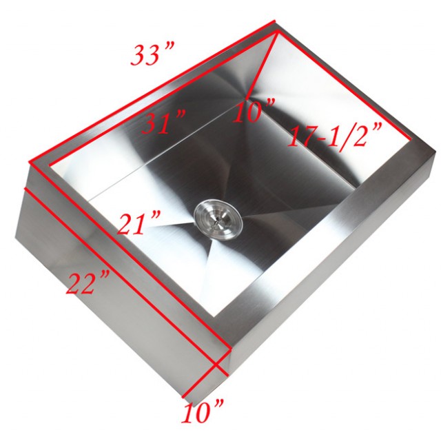 | Dimensions | 33" x 22" (Overall Exterior) 31" x 17-1/2" (Interior) 10" (Bowl Depth) 10" (Apron Depth) |