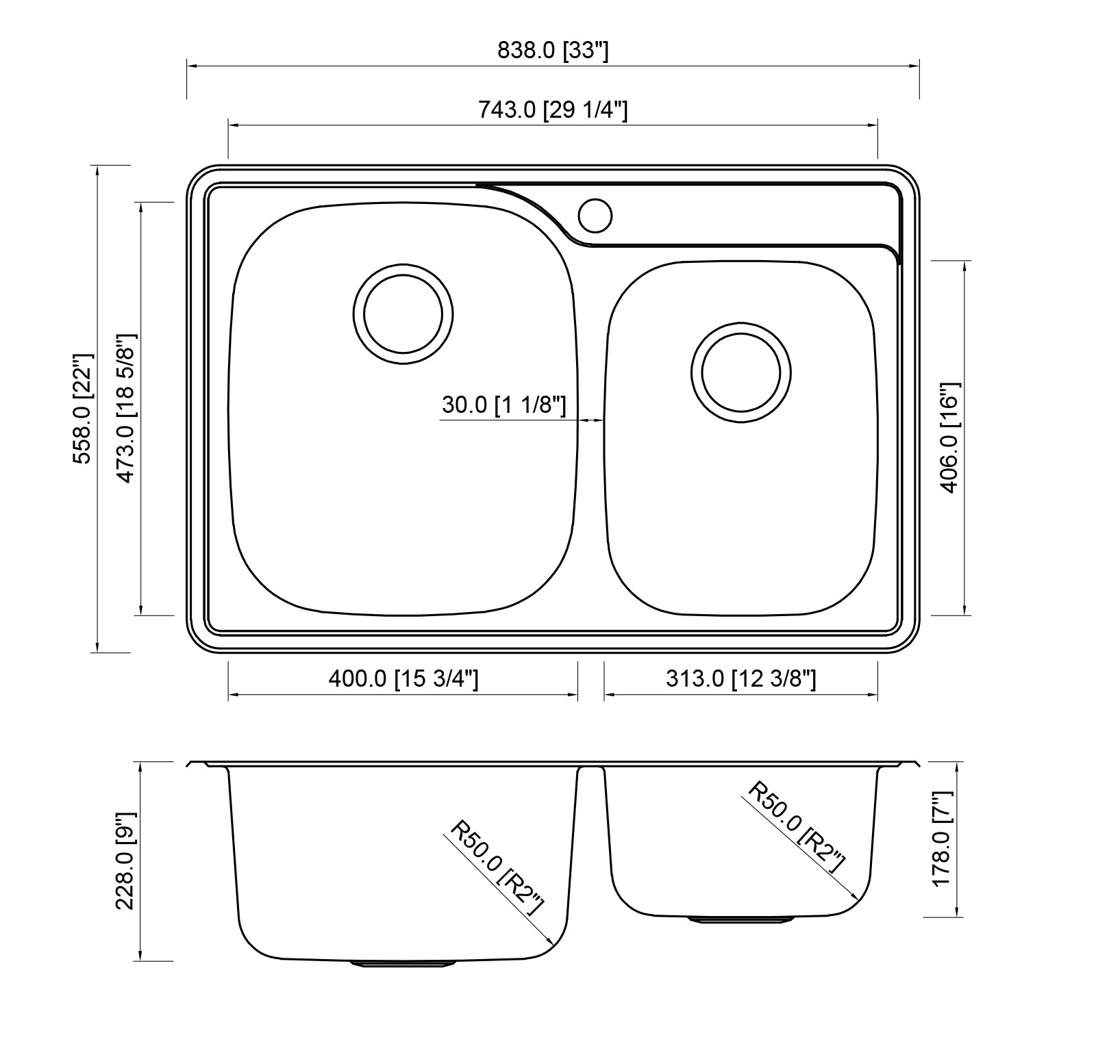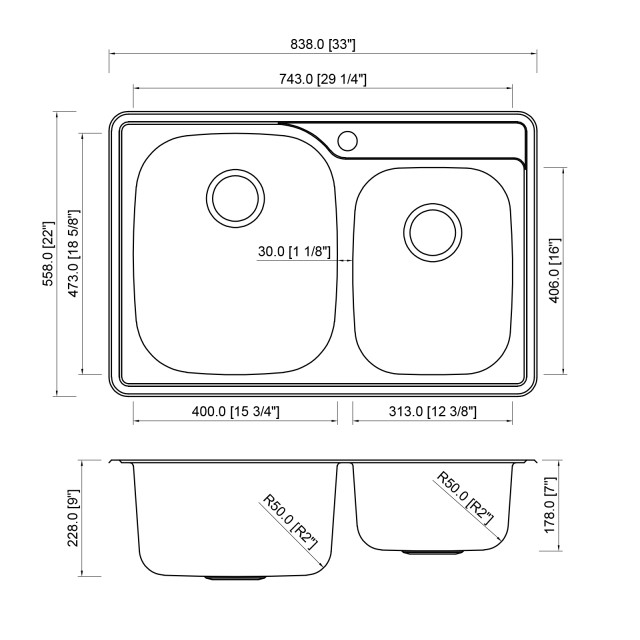 [Dimensions] Exterior Dimensions 33 in. x 22 in. x 9 in. / Left Bowl Size: 15-3/4 in. x 18-5/8 in. x 9 in. Deep /Right Bowl Size: 12-3/8 in. x 16 in. x 7 in. Deep