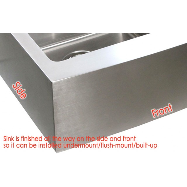 This Farmhouse Apron Front kitchen sink is finished on the side and back, so there are 3 (three) different ways to install this sink - Undermount (Under-Counter), Flush-Mount, and Built-Up: