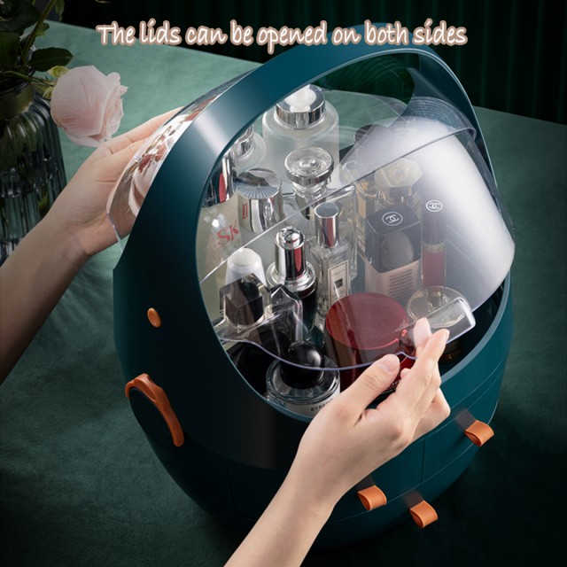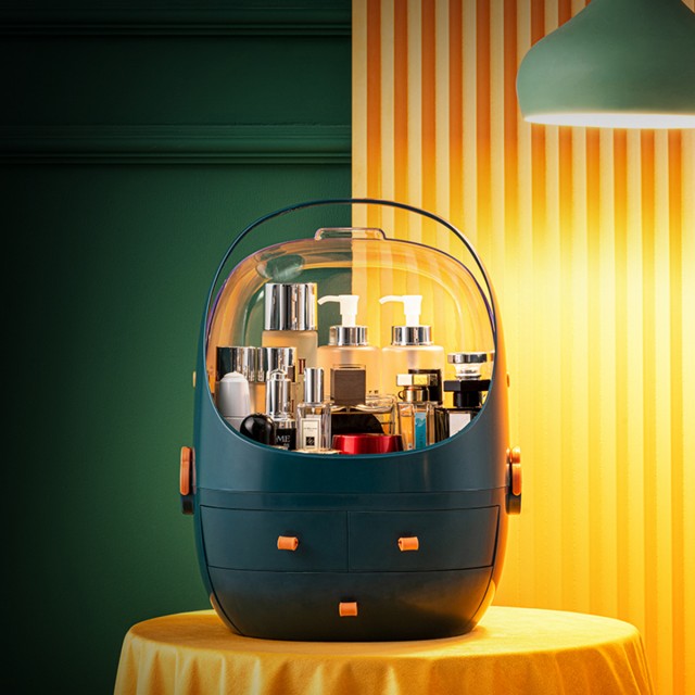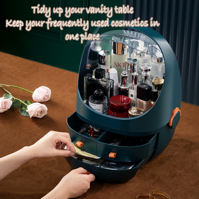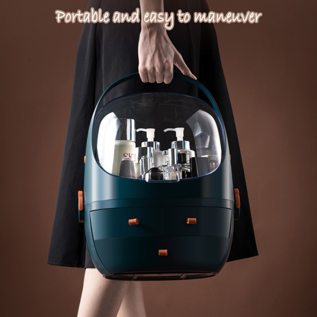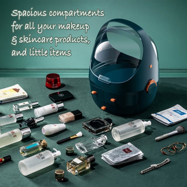 CozyBlock Large Modern Makeup Container Storage in Peacock Green, Cosmetic Display Showcase Box, Dustproof Makeup Organizer, Portable Cosmetic Protective Storage Drawer, Jewelry and Makeup Caddy Shelf Capsule w/ Handle