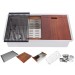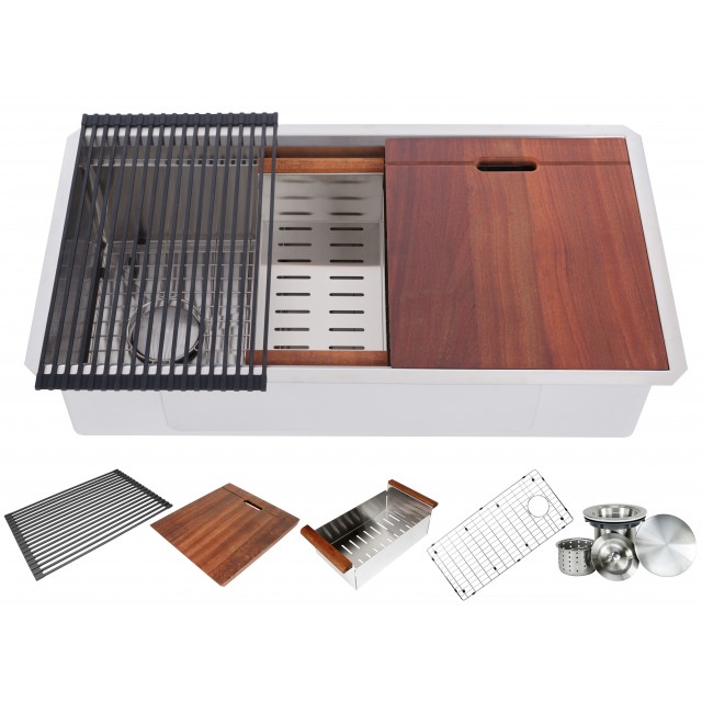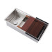 - Complete premium accessories package – silicone dish drying rack, walnut cutting-board, stainless steel colander, protective bottom grid, drain hole cover, lift-out basket strainer