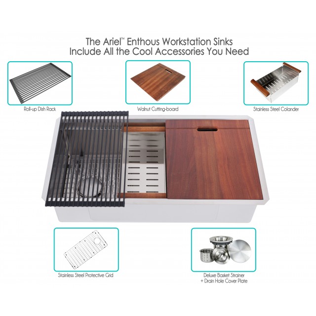 | Includes | Enthous sink, sink protective grid, walnut wood cutting-board, stainless steel colander, silicone-made all-purpose dish rack, drain hole cover, deluxe basket strainer, mounting hardware and cutout template |