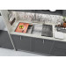 - Built-in 2 level ledges that hold our custom accessories – a silicone-made roll up dish on the countertop, walnut cutting-board on the first ledge, colander on the second ledge; stainless steel protective grid on the bottom of the sink
