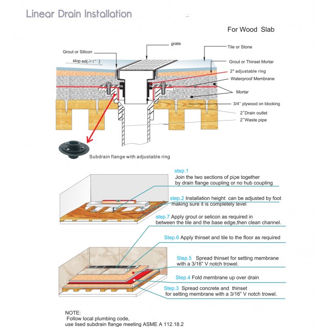 EASY ADJUSTMENT – Linear drain equipped with adjustable feet on both sides, making the linear drain can easily be adjusted precisely to level to the ground. Threaded Adaptor with rubber O-ring aids adjusting the height of linear drain and securing the linear drain to the flange, leak-proof and compatible with most 2” PVC, ABS, and Cast Iron Drain Base Flanges