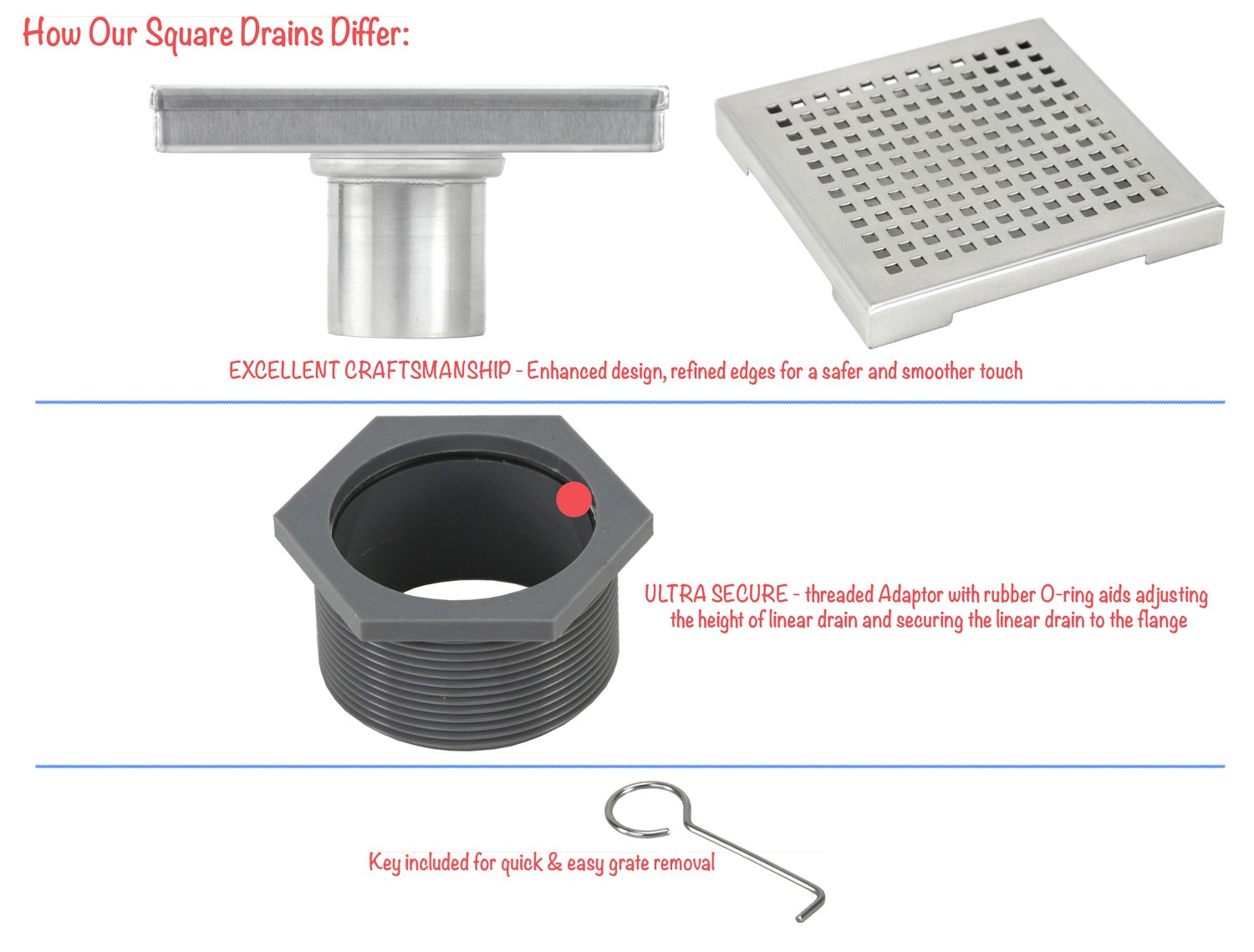 Not all square drains are the same, and we will explain why the our Square Shower Drain with Stripe Pattern Grate makes an outstanding choice: