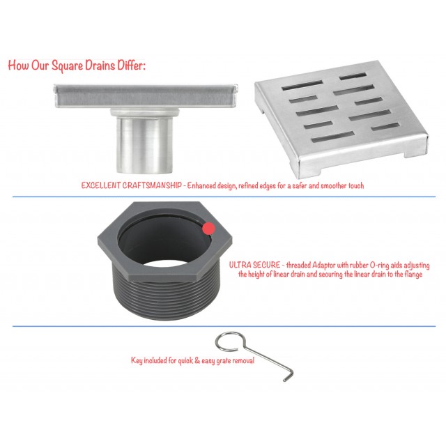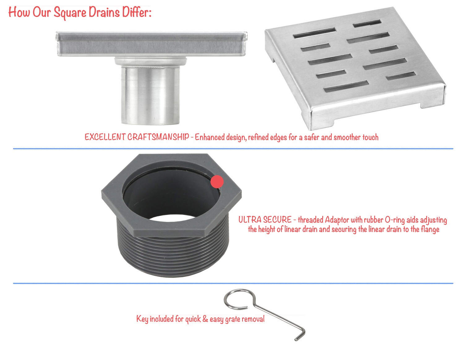 Not all square drains are the same, and we will explain why the our Square Shower Drain with Stripe Pattern Grate makes an outstanding choice: