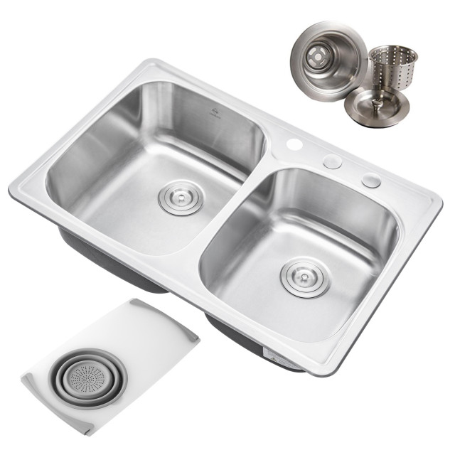 CozyBlock 33 in. x 22 in. x 9 in. 60/40 Offset Top-mount / Drop-in Stainless Steel Double Bowl Kitchen Sink - High Quality T-304 18-GaugeStainless Steel Brushed Stainless Steel Finish, Sink come with a deluxe Lift-out Sink Strainer and cutting board. Each sink is manufactured with an excellent sound-deadening system that absorbs and reduces the noise made by garbage disposal and running water. The top mount design makes the sink has the ability to retrofit existing cabinet. You can upgrade or replace your old sink easily.