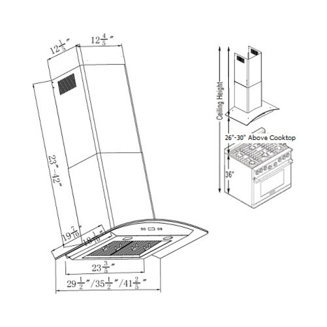 | Dimensions | 35-1/2" x 19-7/10" x (23" - 42") (W x L x H) 6" Diameter (Round Duct Vent) |