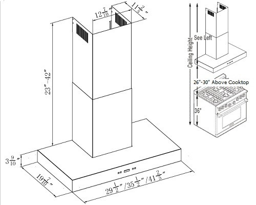 | Dimensions | 35-1/2" x 19-7/10" x (23" - 42") (W x L x H) 6" Diameter (Round Duct Vent) |